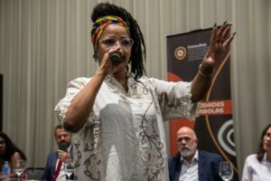 O encontro começou ainda pela manhã, com a recepção aos convidados, falas institucionais, momento cultural e apresentação da metodologia dos trabalhos ao longo do dia. Estiveram presentes nomes como Marcos Alves de Souza, secretário de Direitos Autorais e Intelectuais do MinC; a representante da Fundação Cultural Palmares no Rio Grande do Sul, Maria Conceição; a deputada federal Denise Pessoa; o procurador Daniel Luis Dalberto, do Ministério Público Federal; a secretária de Cultura de Porto Alegre, Liliana Cardoso; a Diretora do Departamento Étnico Racial, Sanny Figueiredo (na foto); a deputada estadual Laura Sito e o vice-reitor da Universidade Federal de Pelotas, Eraldo Pinheiro.